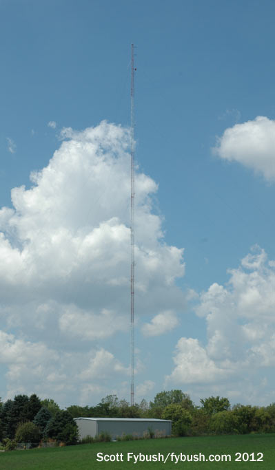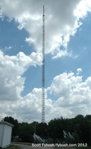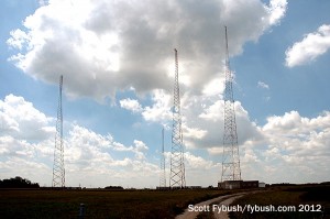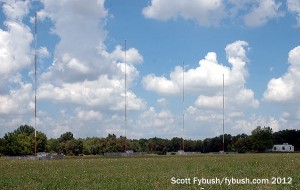 The four towers of what’s now WOAM (1350) sit less than a mile to the southeast, down McDonough Park Drive south of Edgewater. This station has been through some tough times lately, including some silent periods, but in its glory days it was WEEK(AM), the station that spawned WEEK-TV. A later stint as country WXCL gave birth to today’s WXCL-FM on 104.9; these days, WOAM runs standards with 1000 watts day and night, three towers by day and all four at night.