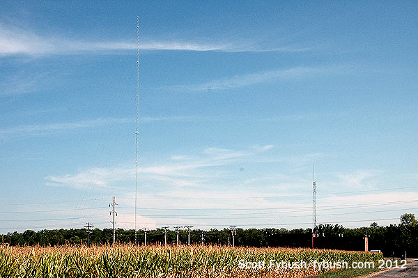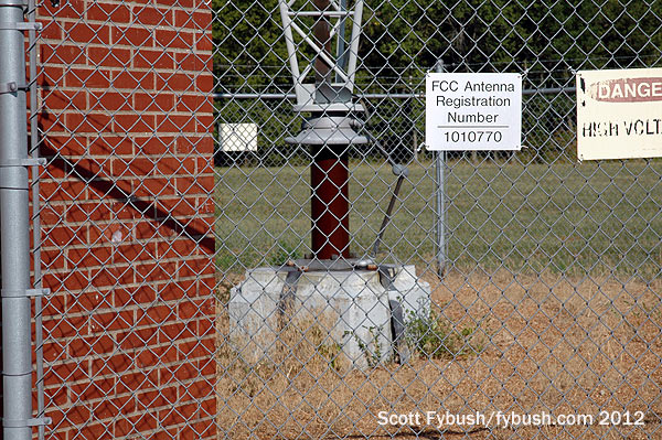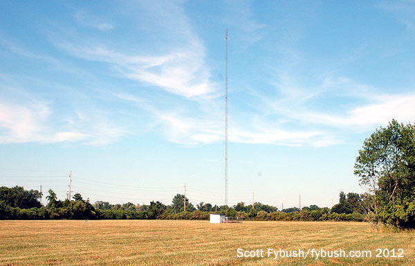 If KMOX’s tower looks far less than impressive, especially in the wide shots higher up on the page, there’s a very good reason: this is not the original tower from 1947. That one was reportedly not new even then, having been removed from WBBM up in Chicago and rebuilt down here at the other end of the state; in the late 1990s, CBS replaced that fat tower with the skinnier, unpainted, strobed model seen here today. But the tower base is original, and so is the doghouse at the base, from which so many years of full-service radio beamed out to the great Midwest.