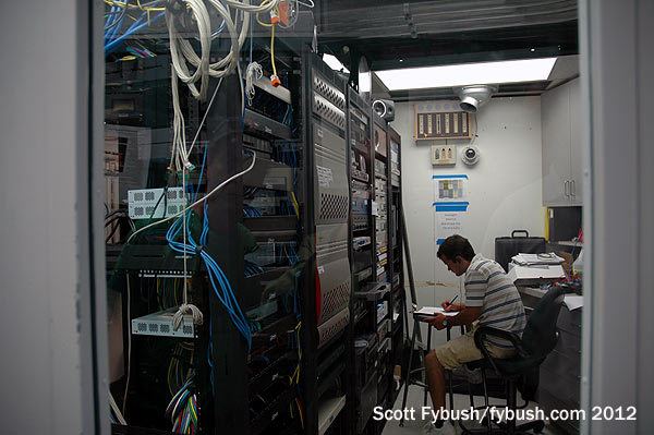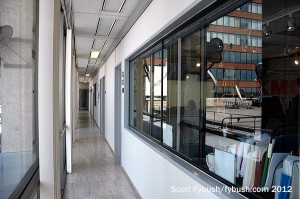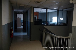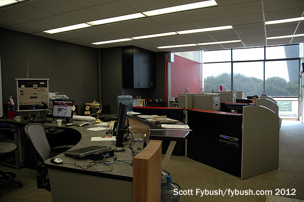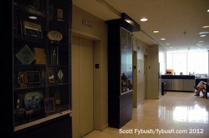 Down the hall, we passed additional production studios, engineering offices and took a peek at the history being stored in an upstairs storage area before looping around to the front lobby and our farewell to this piece of broadcast history. As nice as the view was here, it didn’t make sense for KMOX to stay: it hadn’t been associated with the TV station downstairs since 1985, when CBS sold channel 4 to Viacom, which changed its calls to KMOV. The former KMOX-FM, which had been upstairs in its own space on the seventh floor, was spun off to Clear Channel in the 1990s after CBS’ acquisition of American Radio Systems put it over the ownership cap – and by 2012 CBS wanted to move KMOX in with the ARS FM stations that stayed with CBS, KYKY (98.1) and KEZK (102.5).