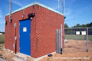 When this brick transmitter building was new, there was lots of Art Deco glass block, much of which has been bricked in over the decades as the site transitioned from manned operation to remote control. The Westinghouse 50-HG transmitter that filled the transmitter room is long gone, replaced in 1973 by a Gates MW-50 and later by Harris DX-50 and then 3DX-50 boxes, the latter hard to see in our wide shot of the room above, since it’s tucked in behind a rack.