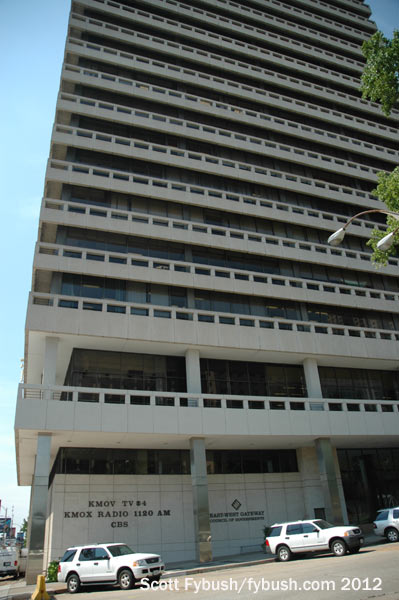 The move to the “Gateway Tower” building, a 20-story behemoth right next to the new Arch, finally united KMOX and KMOX-FM (103.3) with their CBS TV sister station, KMOX-TV (Channel 4). Channel 4 was a late addition to the CBS family, having signed on in 1954 as KWK-TV, sister to a different radio station, KWK (1380). In 1958, CBS abandoned its construction permit for channel 11 in St. Louis and bought channel 4 instead; channel 11 ended up as independent KPLR-TV. (The old channel 4 building at 1215 Cole eventually ended up as home to Sinclair’s ABC affiliate, KDNL-TV 30.)