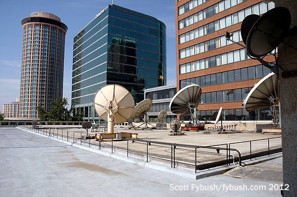 The KMOX studios may not have had the dramatic Arch view, but they did open onto a flag-bedecked patio surrounding the radio and TV stations’ satellite dishes, up on the roof above the channel 4 studios downstairs.