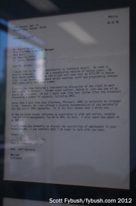 The office Mr. Hyland built himself in 1968 still existed almost intact on this blazing summer day in 2012, straight down the hallway from the lobby. (“Almost” intact because when Hyland retired, he took his massive collection of Steuben art glass with him.) The walk down the hallway, along the front of the building, takes us past the prep area for the KMOX talk staff – and past a break room, where a framed set of letters takes pride of place on one wall.