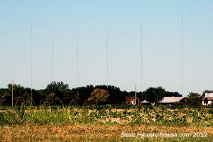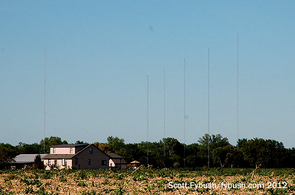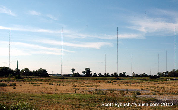 Shown above are two of the three DAs that lined the south shore of Horseshoe Lake, off Illinois 203. In the foreground at left are the two rows of four short towers that long carried KATZ (1600), one of the dominant radio voices of black St. Louis for decades. In 2010, KATZ (now doing black gospel under Clear Channel ownership) left this site behind for a new eight-tower array in Bunkum, Illinois, out to the southeast where I-64 meets I-255. But these towers were still standing in the summer of 2012, and behind them, off to the right (looking a little eastward from our perch on Madison Road next to a Pilot truck stop), we can see the four towers of KTRS (550).