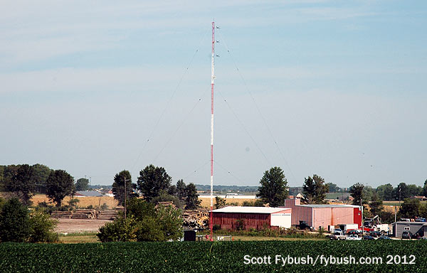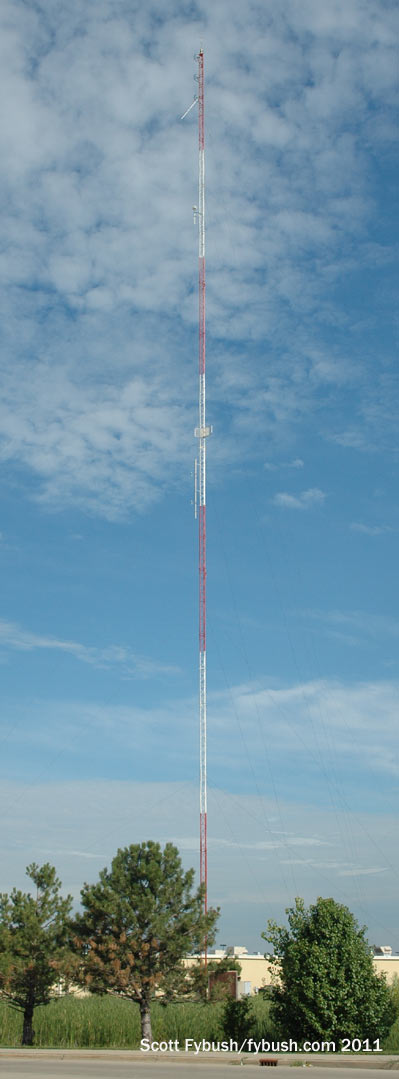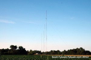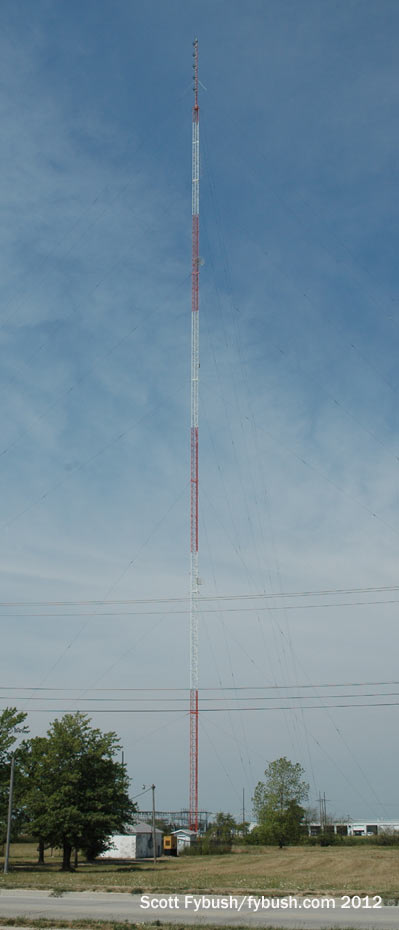 On our 2012 trip, we checked out the other big tower in town, also easily visible from I-55/70 on the southwest side of town. This tower is actually on South Raney Street, just south of US 40, near the giant cross that is an Effingham highway landmark, and it’s home to Cromwell’s signals here in Effingham. News-talk WCRA (1090) is the oldest station in town, going back to 1947 as a 1000-watt daytimer. In 2012, it shared this tower with its FM translator on 100.5 and its class B country FM sister WCRC (95.7). Since our visit, Cromwell has added a new FM here: WJKG (105.5 Altamont) was licensed on this tower last year and is now doing “Jack FM,” having picked up that format from a Cromwell rimshot, WHQQ (98.9 Neoga), that’s now sports.