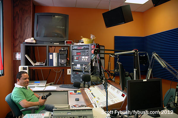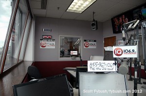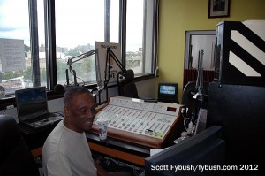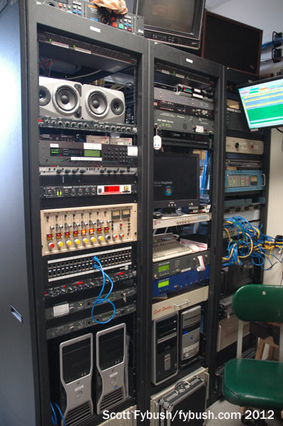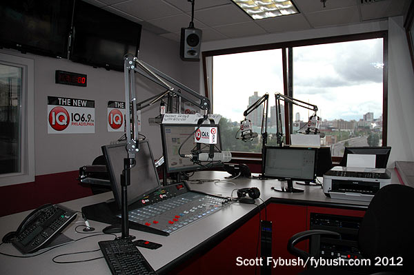 By the summer of 2012, 1341 North Delaware Avenue was home to no fewer than four broadcast tenants scattered around the building, and we got to see three of the four, starting on the third floor at the city’s black talk station, WURD (900). WURD came here in the mid-2000s, and now occupies a small office suite on the west side of the building just off the elevator. There’s a studio complex on the outside wall just past the reception desk, and that leads back to an open office area for sales and programming, with a small tech area off to the side – all fairly simple, for a relatively small station.