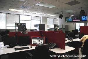 In any event, the WWIQ buildout included a sizable talk studio on the southwest corner of the building, home to a morning show that started off with veteran talker Al Gardner at the helm. The talk studio looked into a control room/news studio, which in turn backed up to a production studio. The production studio was the only room in active use when we wandered in late in the afternoon; the air studio was on automation, and the newsroom was entirely empty.
