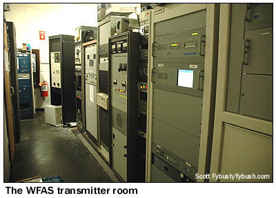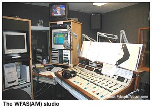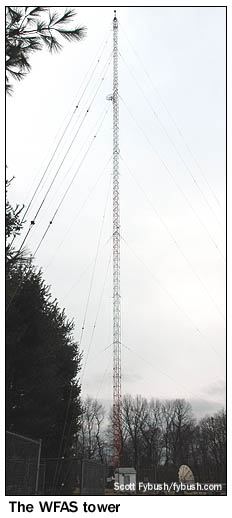 After several sales and format changes (including a few years in the late 70s and early 80s when the FM was known as WWYD), WFAS and WFAS-FM had settled into a period of stability when we dropped by in January 2008. From the lobby (decorated with the top beacon of the old self-supporting AM/FM tower that came down in 1985, replaced by the present 450-foot guyed tower), a window looks into a row of studios, one for the AM station (now playing soft AC, mostly automated outside a local morning show) and one for the FM (with live personalities all day long, playing a blend of workplace-friendly AC tunes).