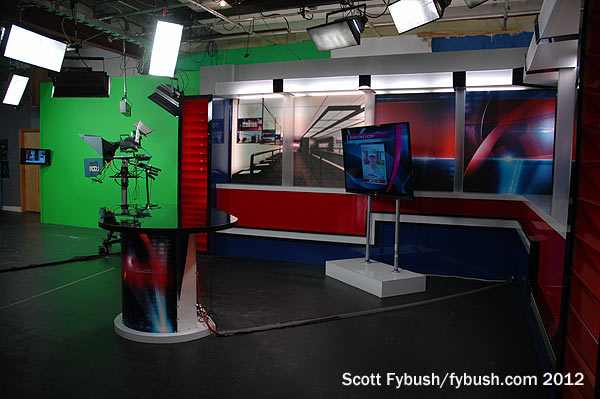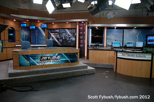 That 2009 TV studio trip also included the building that sits between WQLN and busy Peach Street (US 19) to the west, Nexstar’s WJET-TV (Channel 24) and its Fox sister, WFXP (Channel 66). Not long after the 2009 visit, WJET and WFXP went through a studio upgrade, replacing the sets we’d seen with newer, widescreen-ready versions, and we stopped in for a quick look at those, too:
