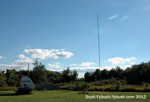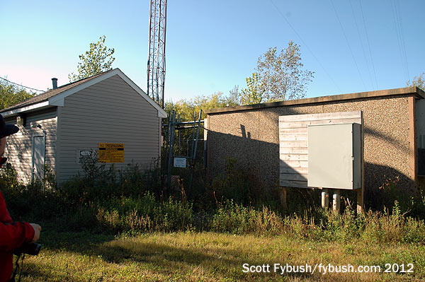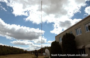 From the WMCE/WYNE studios, tucked away on the ground floor of a building near the Mercyhurst sports fields, we began making our way eastward toward home, stopping off to see the AM 1530 tower at the end of a dead-end road that heads south from US 20 near North East. There used to be a studio building here – in the Rambaldo days, WRKT and sister station WRTS (Star 103.7) both had their studios out in this fairly remote spot – but a fire destroyed that building not long after WRKT and WRTS relocated to the Boston Store building in downtown Erie, and now there’s just a small transmitter shed keeping the AM station alive out here.