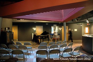The WQLN radio studios look out into the spacious main lobby, which these days itself doubles as an occasional live performance venue. Not long after we left, this space filled up with listeners who came for a piano performance that was simulcast on WQLN-FM. (You can see the WQLN radio studio window behind the piano; the TV master control is off to the left of the frame, with the TV control room, studio and transmitters also off in that wing of the building.)