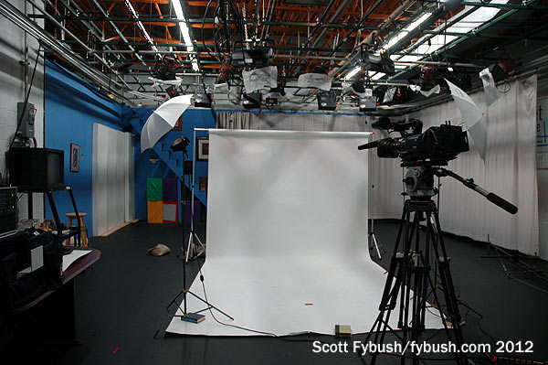 The WQLN-TV studio had been set up for an auction the last time we visited; this time, something else was underway there in front of a white backdrop. Down the hall, we got a closer look at the radio studio complex, too, which features several smaller production/control rooms surrounding a larger space that’s used these days for pledge drives and offices.