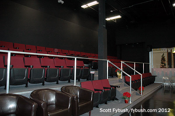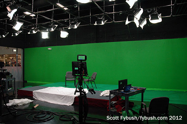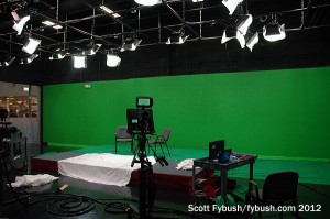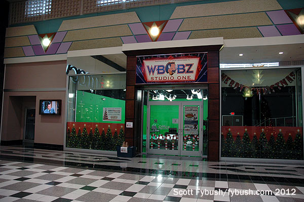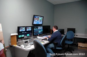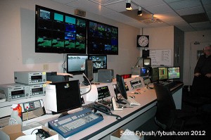 In 2012, you don’t need a lot of equipment to make a TV station look good. This is a simple but effective setup: enter the offices from the door to the left of the storefront studio and you go down a long hallway into an office space with a small, largely automated master control in one corner. That space connects to an equally small but effective production control room next to the studio. That audience seating really gets used, as WBBZ brings visitors in from the mall to serve as a live audience for local productions that include a sports show, talk shows and even a local game show, all interspersed among the MeTV programming that fills the rest of the broadcast day.