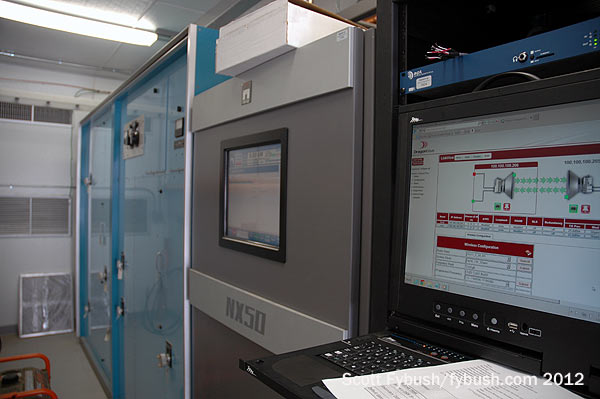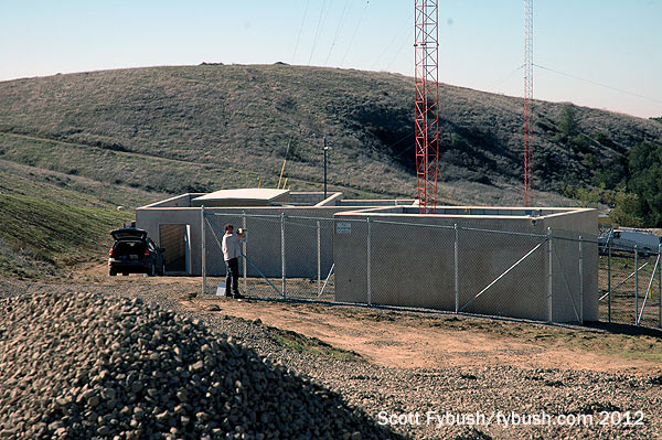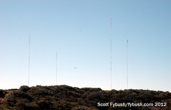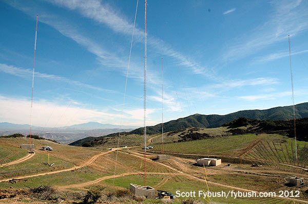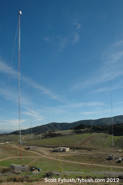 This is an incredibly remote site, considering how close it is to the incredibly dense populations of Orange and Riverside counties. But all those millions of people down in the valleys are separated by some pretty intense hills, and getting up to this site requires a drive over those hills into Corona, navigating our way right to the edge of suburbia, then past a stout gate and up a winding fire road that takes us up to about 2600 feet above sea level, where we see the new KBRT four-tower array in all its glory. (The distant shot above is from the fire road a bit to the east of the array; that jet behind the towers was on approach to John Wayne Airport down in Santa Ana, I think.)