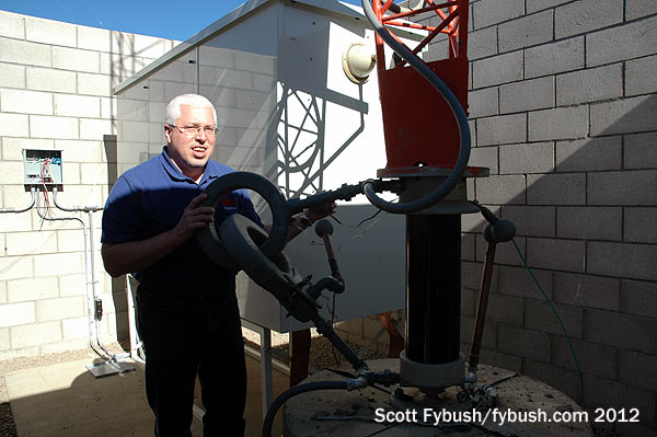 As hard as it is to get up here, vandalism is still a huge concern, and so Crawford put in a lot of work and money to harden this site as much as possible. The prefab building housing the new Nautel NX50 transmitter and Kintronics phasor (and eventually, for backup, the Nautel XR12 that had been the main on Catalina) lives behind a sturdy concrete-block wall with tamper-proof hinges on the heavy steel door. Each ATU and tower base is similarly protected – and just for good measure, there’s special graffiti-resistant paint coating the outside of each of those walls.