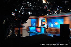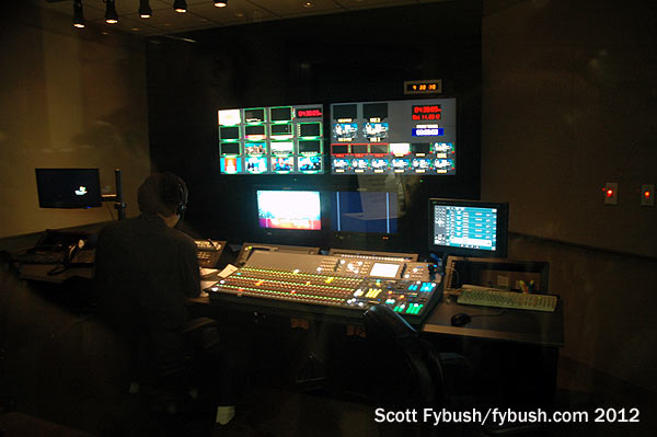 This is a simple but efficient facility: there’s one medium-sized studio from which the nightly “Real Orange” newscast originates, and a control room just adjacent. On the day we visited, the station was taping pledge drive segments to run later that evening, which explains why this photo was taken from a darkened phone bank off to the side of the studio.