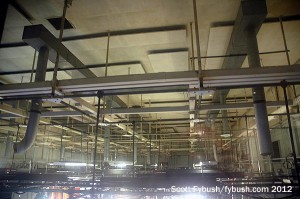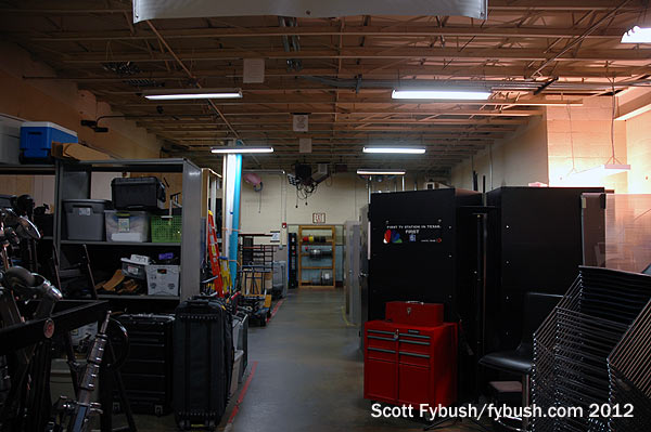 A few other touches from 1948 still remain: that’s an original on-air light that we pass as we walk down the hall to check out some of the behind-the-scenes parts of this big building. Behind the TV studios is a big open area that’s now used for storage, but was once where scenery was moved in and out, not to mention cars for live commercials.