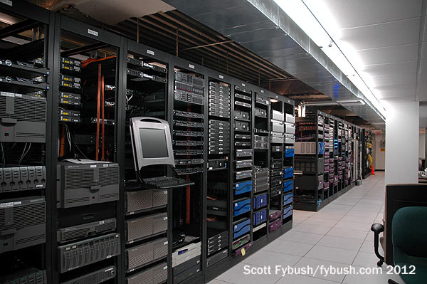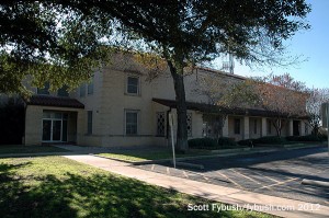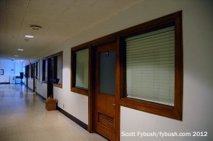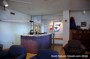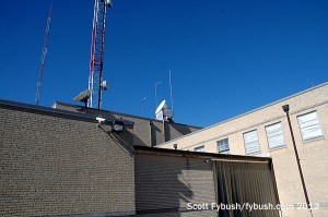 So shall we start our tour? Once past the gate and into the parking lot, the KXAS building looks vaguely like an elementary school – lots of brick, a squat, two-story layout and a little bit of tiled roofing to give a Mission flavor to it all. Inside, once past the lobby, a low-ceilinged hallway runs the length of the building from the rack room on the north end to the newsroom on the south side.