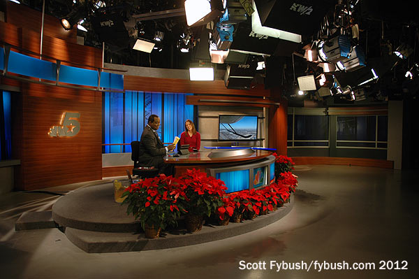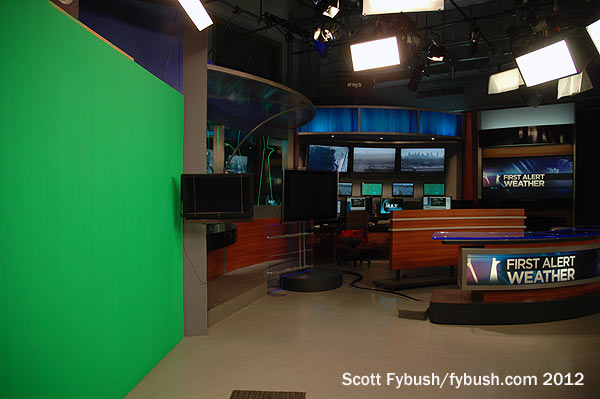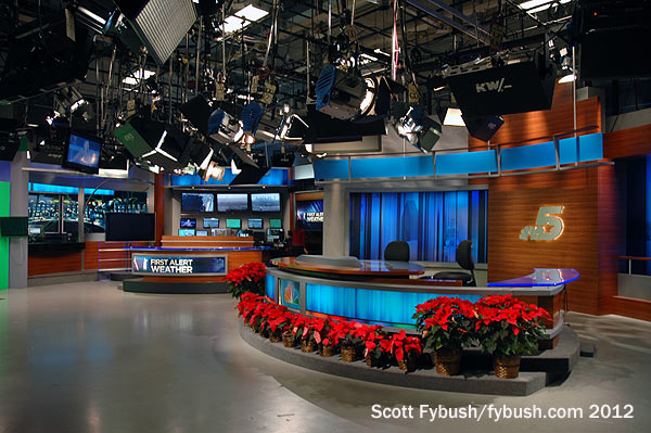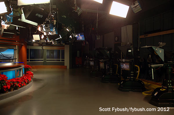 Look very, very closely at the wall up above the weather desk and you’ll see something you don’t see very often these days: there’s a window up there, looking into the studio from what’s now a conference room but was once a sponsor viewing area to peer down through the lighting grid at the live shows that once came out of here.