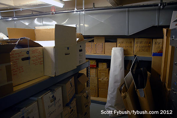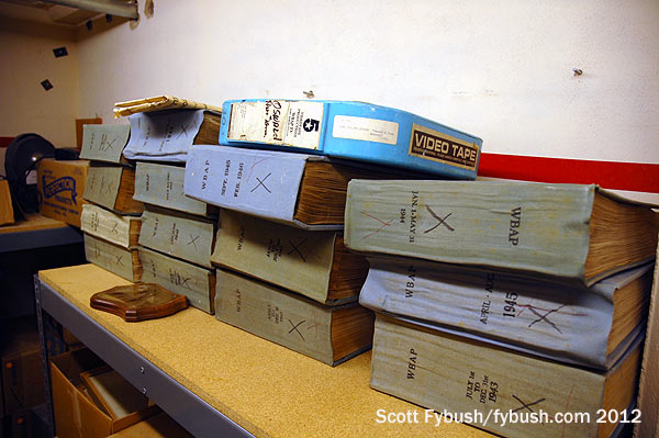 Which brings us back inside the building and down to the basement, a treasure trove of history from both the radio and TV sides of the building. It’s been four decades since the radio and TV stations were sold to separate owners, but even after WBAP radio moved out in 1974, some of its history remained behind, including these logbooks from the 1940s. When we stopped by in 2012, efforts were underway to preserve much of the channel 5 history that still lived down here, including boxes upon boxes of vintage news film and tape. (The Kennedy material, I’m told, had largely already gone to the Sixth Floor Museum over in Dallas.)