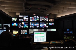 Today, the master control for KXAS is hundreds of miles away in Atlanta, where all of NBC’s owned-and-operated stations contract out their master control operations. The former master control space next to the rack room is now a transmission control area, and when we visit they’re tuning in various live shots for the midday news. Down the hall, the noon news is being produced in a fairly recently renovated control room adjoining the big studio where the KXAS newscasts originate.