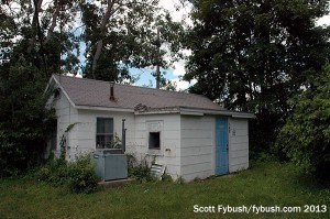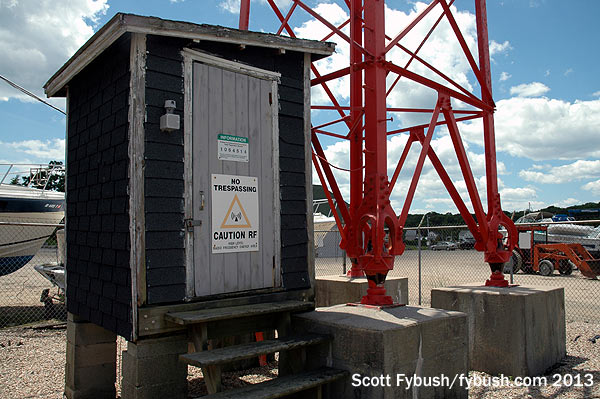 That’s where we find the site that has been home to AM 1230 since its beginning just after World War II. This is the original Blaw-Knox tower that WERI built, and it’s looking pretty good despite all those years next to the water. (As you can see in the photo of the tower base, there’s a marina right next to the tower.)