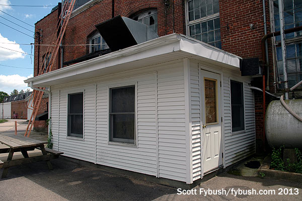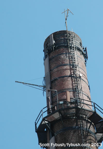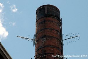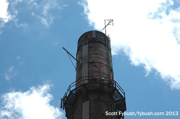 What’s now WSUB-LP started out on a pole behind a gas station here, but a few years ago it relocated to a most unusual site just up the road: a big brick smokestack behind what was once a big printing plant.