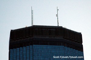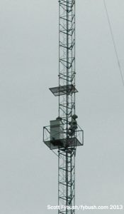 Before we even get to our first tour stop, we look up to notice some big changes atop downtown’s tallest office tower. The IDS Center had a brief moment in the sun in the 1970s as a master FM site for the market’s biggest stations, but they moved out to the tower farm in Shoreview en masse, leaving IDS behind for a while without much full-time broadcast at all, just auxes for most of the Shoreview signals. But the combination of a translator boom and some clever engineering has once again made IDS a fairly important site. It’s now the main site for community station KFAI (90.3 Minneapolis), religious KNOF (95.3 St. Paul) and Cumulus sports talker WGVZ (105.7 Eden Prairie), as well as an ever-growing forest of translators, most of them associated with the Clear Channel cluster or its partners over at EMF Broadcasting. In that view from above, that’s all the auxes (mostly in the 35-40 kW ERP range) combined into the antenna on the west tower (on the left in this view), with KNOF’s single bay above WGVZ’s two on the east (right) pole.