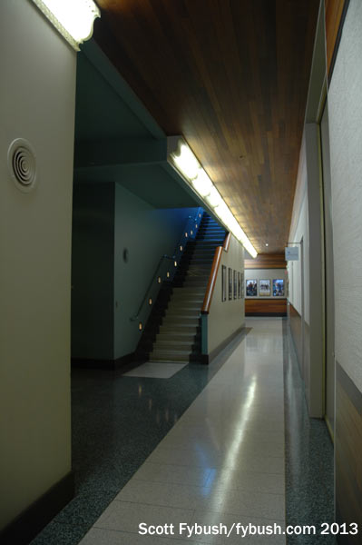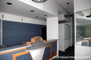 For a few years in the 1980s, though, KSTP(AM)’s studios weren’t there. In 1985, Hubbard moved the AM station’s operations out here to Maplewood, carving out space on the south side of the transmitter building for studios, offices and a new lobby built with Art Deco touches – and the original Deco lighting that had graced the building four decades earlier. The studio and office space stayed in use out here until 1999, when Hubbard renovated the University Avenue facility and brought the AM studios back in with its TV and FM sisters. (More on the FMs in a moment…)