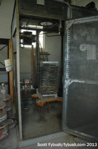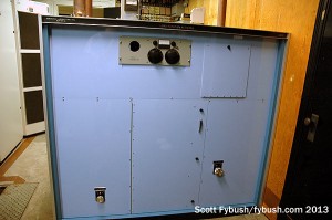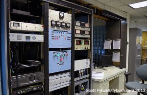 The transmitter room at the center of the building is basically what’s left of the original transmitter room after the studio space was carved out. Today, it boasts a Harris 3DX50 as the main transmitter (center), with an older MW50 for backup (right) and a Continental FM transmitter (left) as a last-ditch backup for KSTP-FM (94.5), which makes its usual home a few miles northwest of here at the big Telefarm tower complex in Shorewood. Behind the AM transmitters, an equipment room includes a phase rotator designed to give a better match between the transmitter and the unusual Franklin-style daytime tower out back, which consists of a 179-degree radiator stacked atop another 179-degree radiator, with an insulator and feedpoint at the middle.