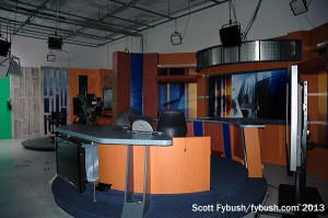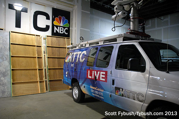 The sign from the old downtown studio (now demolished) hangs in the garage over one of KTTC’s live trucks. This is probably a good point at which to note the strange, sprawling nature of the TV market in which KTTC resides: it includes not only a huge swath of southeastern and southern Minnesota from Rochester all the way over past Albert Lea, 60-plus miles down I-90, but also a big chunk of north-central Iowa centered on Mason City, a nearly two-hour drive from Rochester.