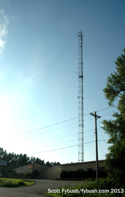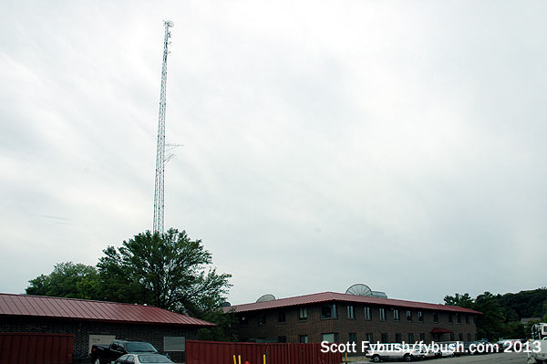 With a few hours of summer daylight still beckoning and the skies finally clearing, we set off from our late-afternoon KTTC tour to see some of the towers that dot the Rochester area. Our itinerary doesn’t include enough time to go south to the TV towers, alas, but we’re able to explore the rolling terrain around the city. This Rochester sits in a valley, and as we approach the hills that line the west side of town, we pass the lakes and parks of the west side, where KROC (1340)’s current tower sits next to Cascade Lake just south and west of the US 52/US 14 interchange.