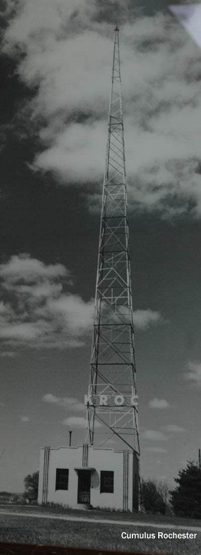One wall of the current KROC building (facing the parking lot where I believe the KROC-TV/KTTC building used to be) is painted with a giant vintage radio, and inside there’s a nifty photo of the original KROC radio tower, up there on the west hill where the TV tower was later built (and where KFSI now transmits).