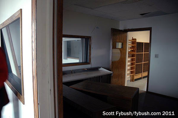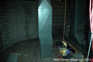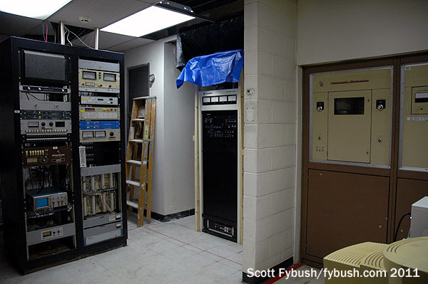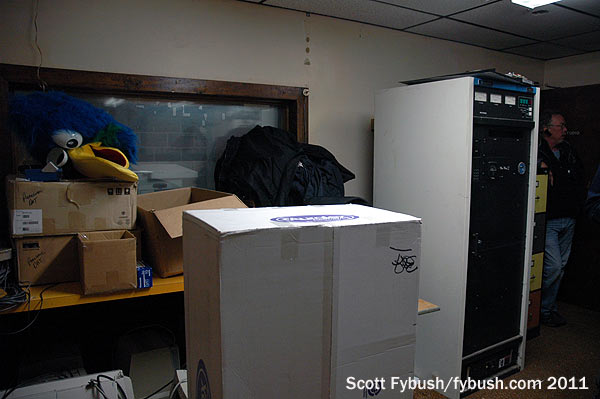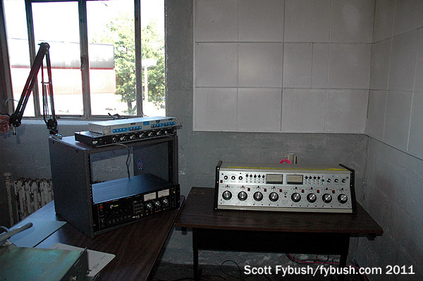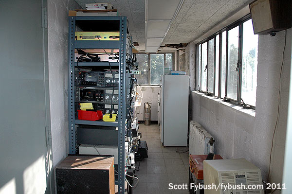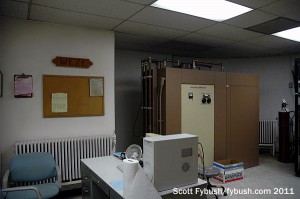 Upstairs, there’s former studio equipment lined up in what used to be engineering office space, and a very makeshift emergency studio set up in another former office corner overlooking the upper section of what used to be the two-story transmitter room, which must have been quite the sight to see when it was new. (Now it just carries ventilation from the transmitter room up to the roof.)