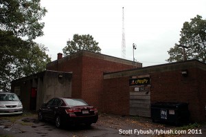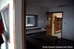 Hallways leading in two directions from the transmitter room go to former studio spaces, now used for storage. There’s a room in back that I think served as the transmitter room when WEZE had its office here, and it in turn leads out to the catwalk that runs out into the swamp where the three self-supporters sit.