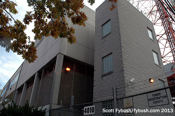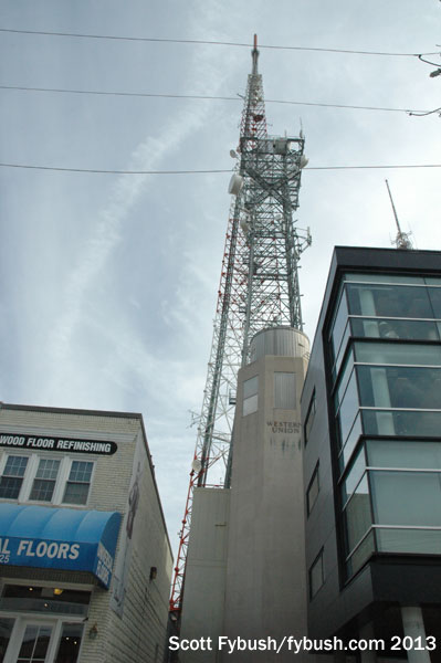 Meanwhile back in Tenleytown, a mile away, the view from the old WAMU studios looked out across Brandywine to the old WTOP “Broadcast House,” now a health club – and behind that to the TV towers that sits on the highest ground in the District of Columbia.