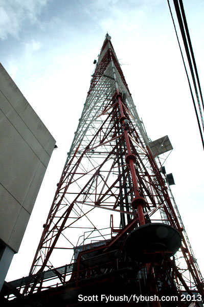 The 640-foot tower we see here went up in 1972 to augment the shorter 300-foot self-supporter that was the original tower at Tenleytown, built in 1949 for channel 9 (then WOIC, later WTOP-TV and WDVM and now WUSA-TV). When the new tower went up, it became home as well to WMAL-TV (Channel 7, now WJLA), which moved here from its original site on the American University campus (which still stands and is used by WAMU and several other FM stations); later on, several UHF stations moved in here as well.