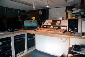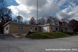 The studio first: this low-slung building is split roughly in half, with offices on one side and studios on the other. Our focus, of course, is on the studio side: there’s an elevated main studio in the front of the building, and toward the back a larger room that was the original WBYO studio and now serves as a talk studio. The old tower site sits out back, up the hill, where an STL path now aims over to the main tower site.