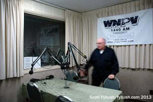 WNPV is a talk station these days, and there’s a talk studio across the glass from the control room console, down the hall behind the station’s sales offices.