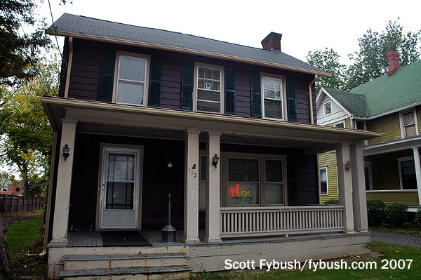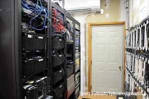 When WEOS was in full swing here, the front door facing Hamilton Street (Routes 5 & 20) was kept locked most of the time; instead, visitors entered from the rear door, facing toward the college campus. A back hallway led into the station’s main hallway, where the path to the front door was interrupted by what passed for the WEOS tech core – two racks of audio and networking gear, including the guts of the Logitek consoles that powered the studios.