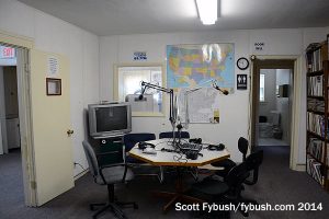 There’s a newsroom and a few small news booths down this side of the hall as well, leading down to the studio at the end of the hallway that’s the current home for WGVA’s “Finger Lakes News Radio” format. From here, the WGVA morning show is semi-simulcast with WAUB 1590 in Auburn, to the east, where a morning co-host does local news cut-ins for Cayuga County. Both of the Finger Lakes News Radio AMs have FM translators these days, too – WGVA on 96.1 and WAUB on 98.1.