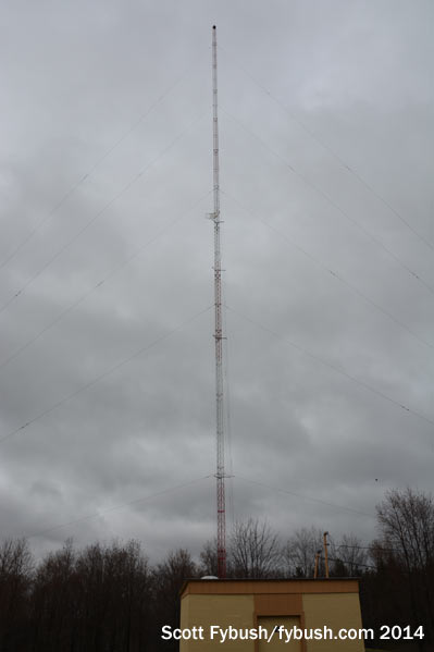 WKBI(AM)’s tower is still at the old studio site on Melody Lane over in St. Mary’s, a dozen or so miles to the east, and while the studio building has been torn down, the AM transmitter sits in a clean little building that used to be out back of the studio. There’s a new Nautel in the rack at right, and that’s an older Energy-Onix for backup at left.