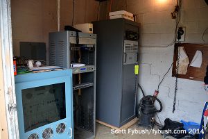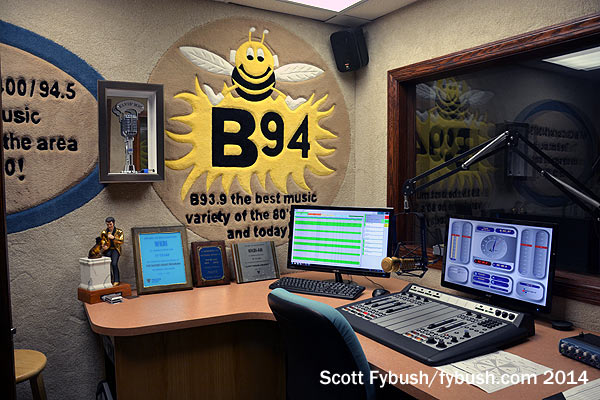 Two more stations recently joined the Hound up here on Bootjack Hill: Heindl bought WKBI (1400) and WKBI-FM (93.9) from Cary Simpson’s Allegheny Mountain Network in 2013 and moved them in to the WDDH building from their former home over in St. Mary’s. They’re largely voicetracked, but their local talent comes from a studio just across the hall from WDDH at the back of the building, where WKBI-FM’s hot AC “B94” and WKBI’s soft AC formats are promoted with some nifty carpet work on the wall!