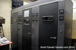 Inside the WAKR transmitter building, there’s a venerable RCA holding down backup duty adjacent to the phasor and the Nautel AMPFET that is WAKR’s main transmitter.