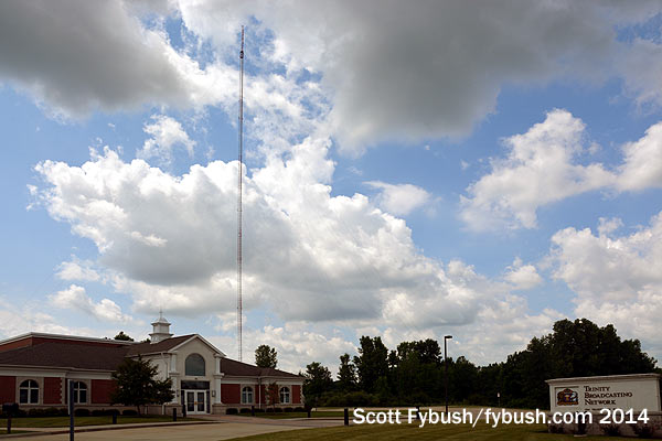 Two more sites out here round out our drive-by visits: heading west again on Route 261 from the WVPX/WONE tower, we find the newest stick in the area. Trinity Broadcasting’s WDLI (Channel 17) is licensed to Canton, but the DTV transition eventually landed it on RF channel 49 (WEAO, which had been the last occupant of analog 49, is on RF 50) and allowed it to build a new tower and big studio facility up here in Copley, near Akron, with better coverage up into Cleveland.