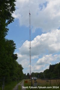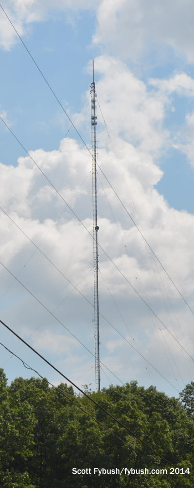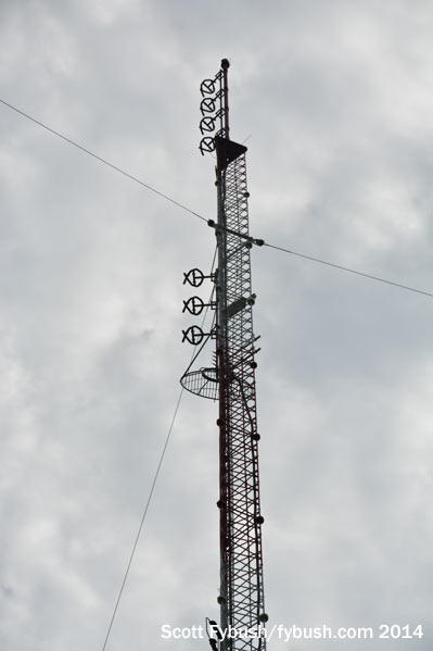 From the south side of Akron and the WAKR site down by the I-77/US 224 junction, we wrap up this week’s installment with a quick drive past the TV-FM tower farm on the west side of Akron. Off Cleveland-Massillon Road, that 925-footer shown above at left belongs to WEAO, the PBS outlet that took over channel 49 after WAKR-TV slid down to channel 23. Today, it’s shared by WEAO (half of “Western Reserve PBS,” whose other signal is down in Alliance, between Canton and Youngstown), Kent State’s public radio outlet WKSU (89.7), the University of Akron’s WZIP (88.1) and WAKR’s FM sister WQMX (94.9 Akron). And it’s behind a locked gate, so we can’t get much closer than the view above, alas.