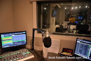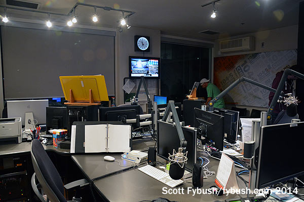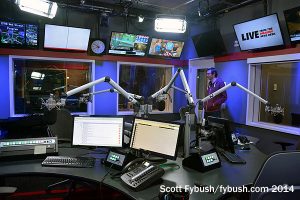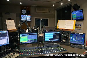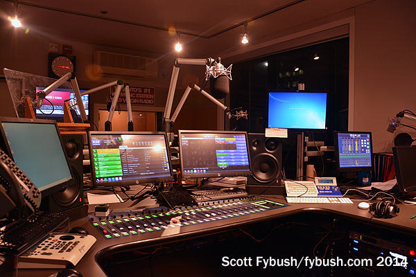 CFRB, meanwhile, ended up two floors up in a new and very spiffy newsroom/studio complex. The main talk studio at the core of the complex, about halfway down the Duncan Street side of the building, is more than just a radio studio: it’s got a full lighting setup for TV simulcasts and video streaming. One side of the studio looks into the main CFRB control room (where the evening’s talk show is originating off-site), and the other looks into a second studio space.