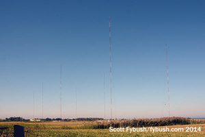 These sites all showed up in the 1980s, when clever Toronto engineers figured out they could aim directional signals north across the lake right into downtown Toronto. Most prominent, at least from the highway, is the eight-tower array of CFTR (680), north of the highway right on the lakeshore in Grimsby, Ontario. When these towers went up, this was a rural area, and for years the only company these towers had nearby was a small commercial strip with a Tim Horton’s, a Swiss Chalet and a Harvey’s hamburger joint. (Guess where we liked to stop for a snack along the way?)