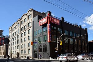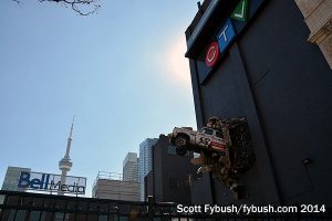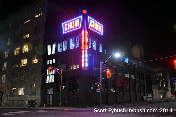 Here’s where things get tangled up in weird, weird ways: the whole time CITY-TV was at 299 Queen Street West (1987-2009), that building was not actually home to CHUM’s radio stations. CHUM (1050) and CHUM-FM (104.5) were uptown at the 1331 Yonge St. building that they’d called home since 1959. Only after Bell had acquired most of ChumCity’s assets did the CHUM stations leave Yonge Street for the complex of buildings connected to 299 Queen West – and by then, CITY had been spun off to Rogers and moved over to Dundas Square. The main building at 299 Queen West remained home to the specialty networks Bell kept from the ChumCity deal, including MuchMusic and the CP24 all-news channel, and the signage on the building changed from “City” to “CTV,” though the main CTV production facility stayed put out east in suburban Scarborough. After some uproar about its possible removal, the old Citytv “news car” sticking out of the building’s east side stayed in place, now with CP24 signage.