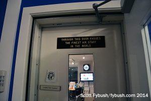 CHUM-FM’s studios sit right on the corner, looking out to Richmond and Duncan streets directly beneath the bottom of he CHUM sign. Like its former Yonge Street space, this is a spacious studio with lots of room for a busy morning show, including a separate producer/news booth facing into the main studio. And what’s that on the thick door leading into the studio? The very same “Through these doors…” sign that came over from the old CHUM studios! (As always, click on each picture for a larger version.)